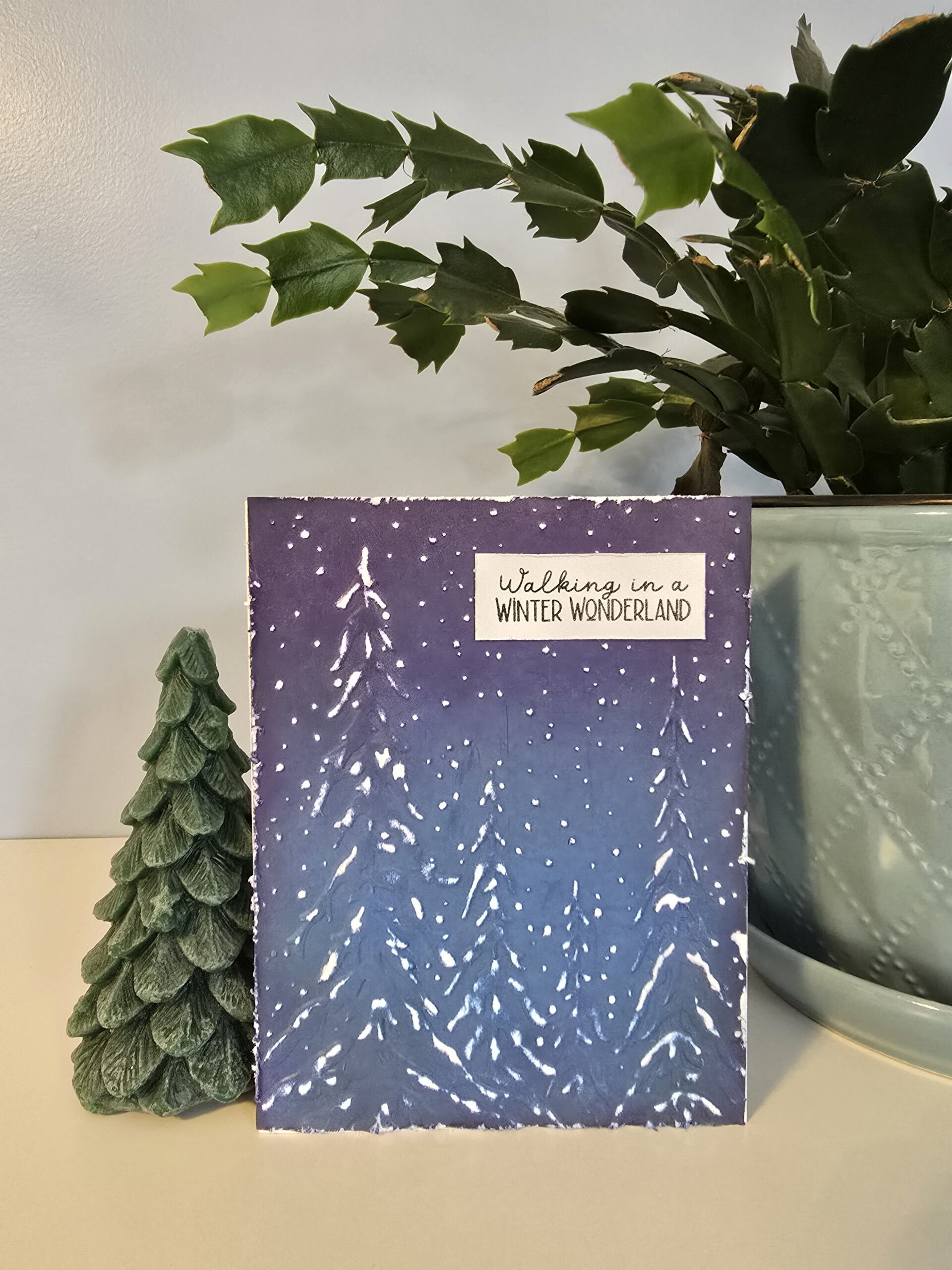 Today I was in the mood for a Christmas card, so I dug out one of my favorite winter embossing folders, some distress oxide inks, and an emery board. Time to play! I started by inking up a 4 ¼ x 5 ½ inch panel of white cardstock. I used four different distress oxide inks.…