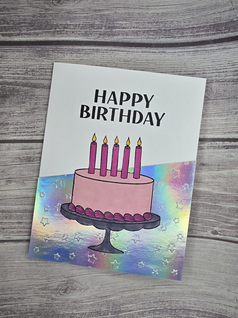Using the Simon Hurley Birthday Basics stamp set, I stamped a large birthday cake onto light pink cardstock. I colored the cake with copic markers and gelly roll pens.