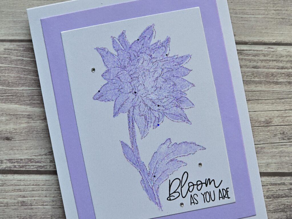 For the white shimmer card, I cut an A2 card panel from white shimmer cardstock and glued it to a white A2 card base. I glued the purple panel on and then the flower panel. I stamped ‘Bloom as you are’ from the Self-Care Sentiments stamp set by Alex Syberia designs in the bottom right corner. I left this card blank inside.