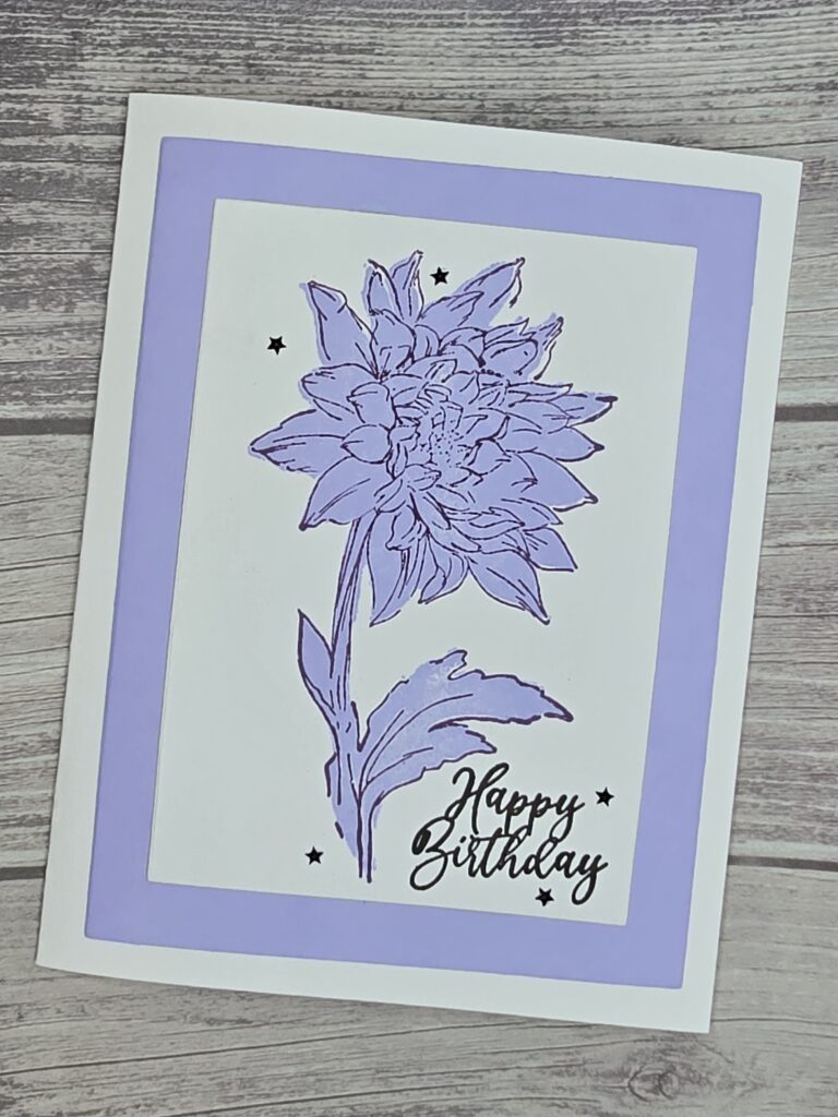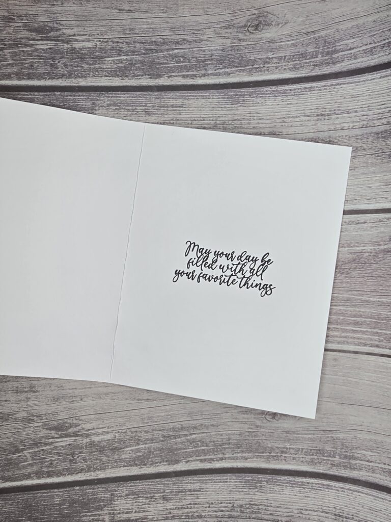 For the white card, I glued the purple mat layer to a white A2 card base, then glued the flower layer on. I stamped ‘Happy Birthday’ in the bottom right corner using a stamp from the Inside Sentiments Birthdays stamp set by Waffle Flower. I used the same set to stamp a greeting inside.