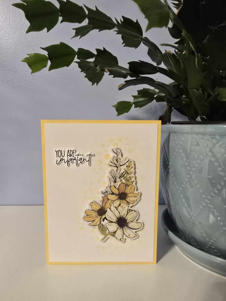 I used the same stamp set for the sentiment, this time choosing the one that says ‘you are important’. I cut it out with the die, again cutting two extra pieces. Once I glued them together, I glued them onto the card.