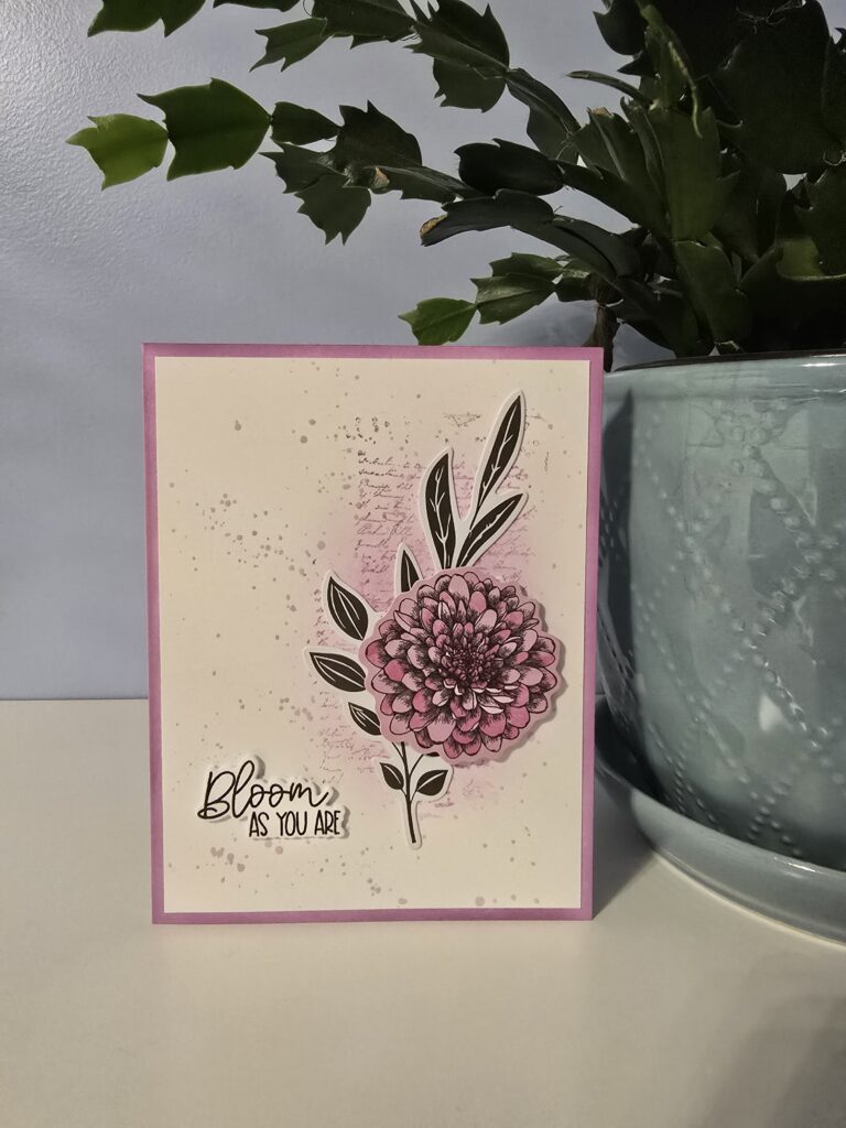For the sentiment, I stamped ‘bloom as you are’ from the self care sentiment stamp set by Alex Syberia design. I used the coordinating die to cut it out, cutting two extra pieces. I glued them together to give added dimension and then glued the sentiment onto the card.